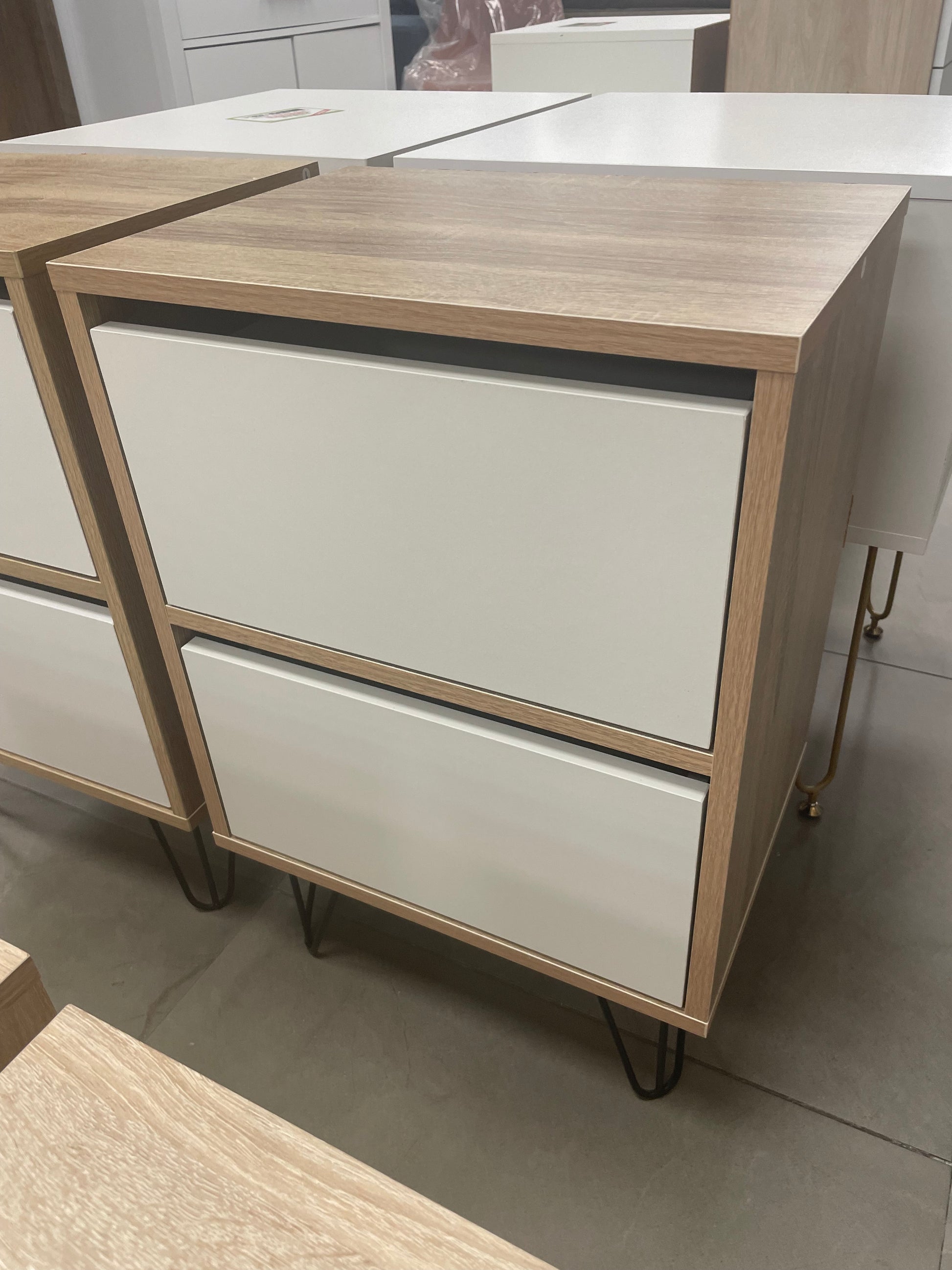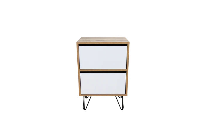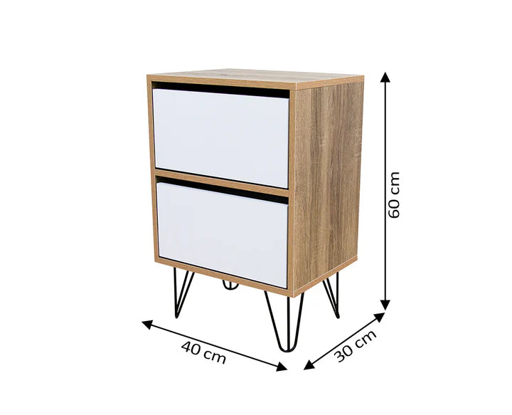 Combina estilo y funcionalidad en tu dormitorio con nuestra moderna y elegante mesita de noche. Con su diseño contemporaneo, esta mesita es la compañera perfecta para tu cama, proporcionando almacenamiento practico y un toque de sofisticacion. Los dos cajones espaciosos de la mesita de noche te ofrecen un espacio de almacenamiento adicional para tener tus articulos personales organizados y al alcance de la mano. El acabado en blanco cambria le da un toque de luminosidad y frescura a la mesita, mientras que las patas metalicas negras le confieren un aspecto moderno y elegante. Su diseño compacto y versatil tambien la convierte en una opcion perfecta para otros espacios de la casa, como el salon o la sala de estar. Facil montaje.